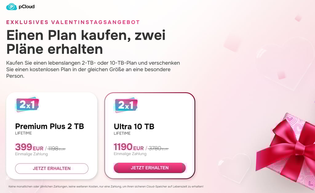 Verfügbar bis zum 16. Februar 2024, bietet dieser Tarif eine einmalige Zahlungsmöglichkeit für eine lebenslange Sicherung von 2TB Speicherplatz. Dieses Angebot ist ideal für Einzelpersonen, die ihre digitalen Daten sicher, zugänglich und ohne Sorgen um wiederkehrende Abonnementgebühren speichern möchten. Mehr erfahren (Werbepartner).